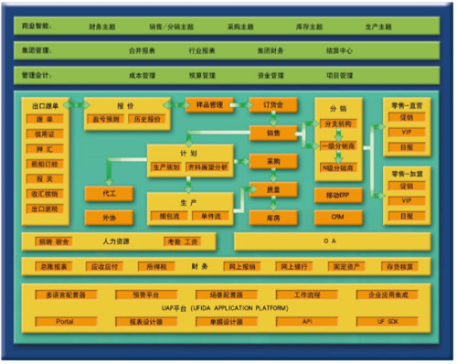 用友U8 服装行业解决方案由分销、零售、产品数据管理、订货会、模拟接单、出口、计划和生产、仓储与条码、订单全生命周期、集团管理模式、UAP 等组成,解决了服装服饰企业从外部的销售渠道管控到内部的生产管理、成本核算等重要业务问题。
