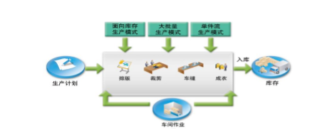OEM 加工企业:财务(核算、管理)+物流(采购、库存、销售)+生产计划及执行(计划、订单)+生产管理(裁减、缝制、包装)+产品管理。